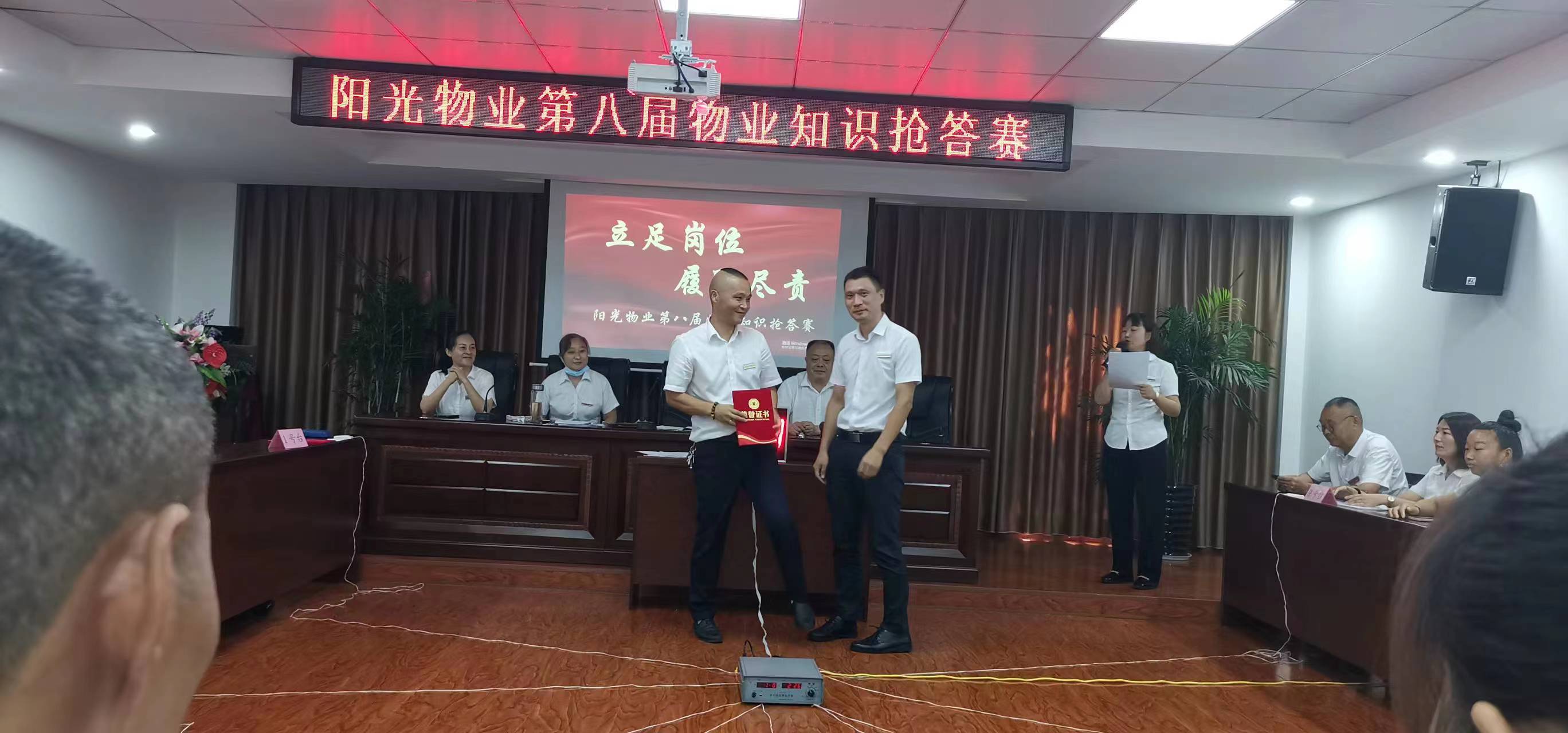 在大家共同的協(xié)調(diào)和配合下,陽光物業(yè)第八屆物業(yè)管理知識搶答賽取得圓滿成功。活動(dòng)現(xiàn)場掌聲雷鳴,充滿了歡快熱鬧的氣氛,各參賽隊(duì)積極參與,主持人風(fēng)趣幽默,現(xiàn)場井然有序,笑聲不斷。比賽由必答題、搶答題、風(fēng)險(xiǎn)題、觀眾答題四個(gè)環(huán)節(jié)組成。經(jīng)過一番激烈的競爭,最終由仙源保障房、廉租房組合的完美隊(duì)取得第一名,由廣德花苑、陽光鑫都組合的輝煌隊(duì)獲得第二名,總部和公園壹號組合的葵花隊(duì)取得了第三名,陳勇同志以答對9題的優(yōu)異成績脫穎而出獲得優(yōu)秀答辯手獎(jiǎng)項(xiàng)。